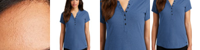 Designed for dynamic impact, this henley looks and feels like cotton, but still performs with stretch. 4.6-ounce, 73/21/6 cotton/poly/spandex jacquard jersey with stay-cool wicking technology OGIO heat transfer label for tag-free comfort 6-button placket with flat metal buttons Front princess seams Pleat at back yoke Contrast coverstitching on back yoke and at buttonholes Set-in, open hem sleeves Rubber heat transfer O at left hem